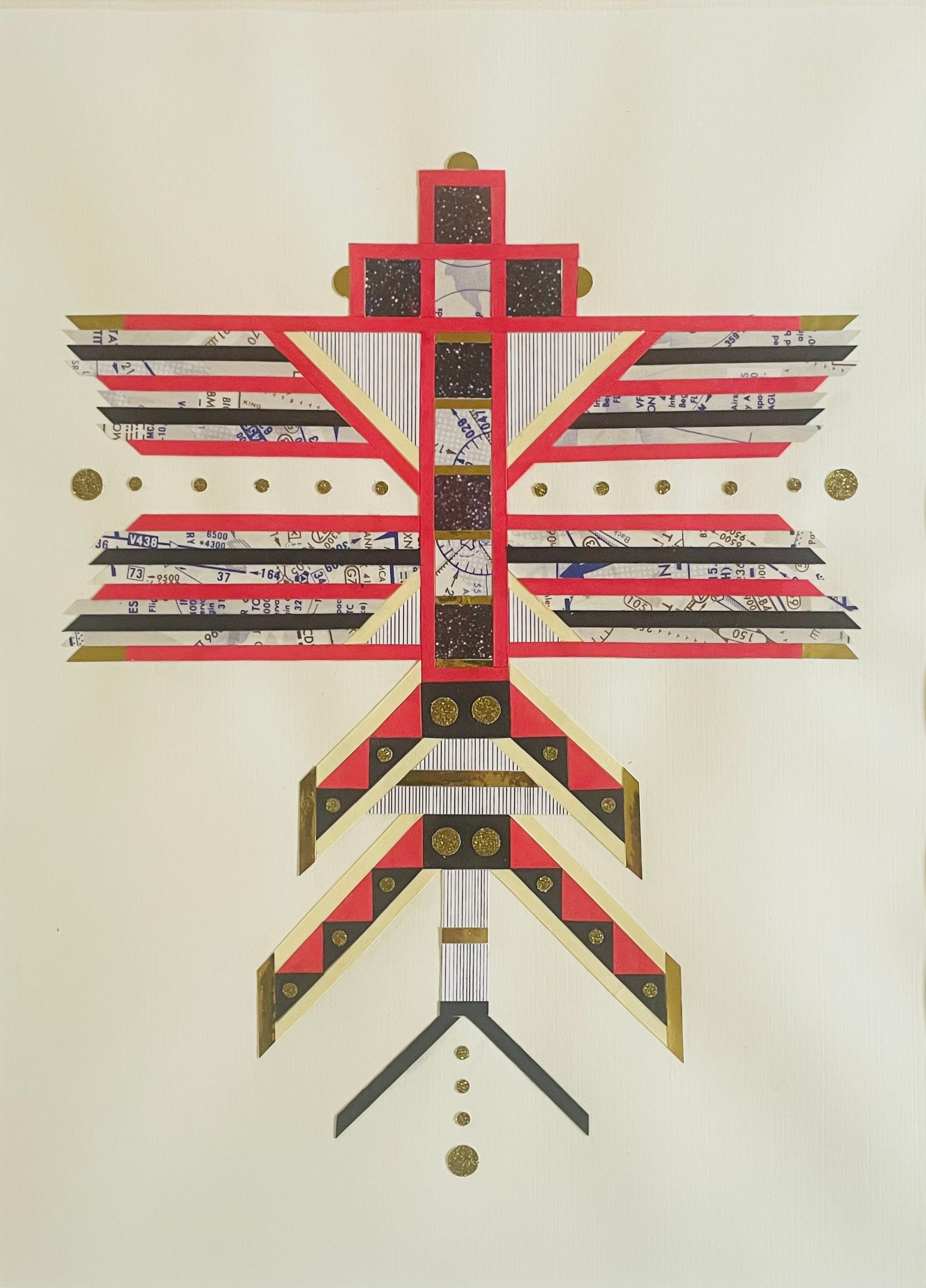 Collage on paper. Materials: colored papers, hand-drawn patterns, fancy cookie box, old library book checkout envelope, old aeronautical charts, glittery gold crown, and outer space images.